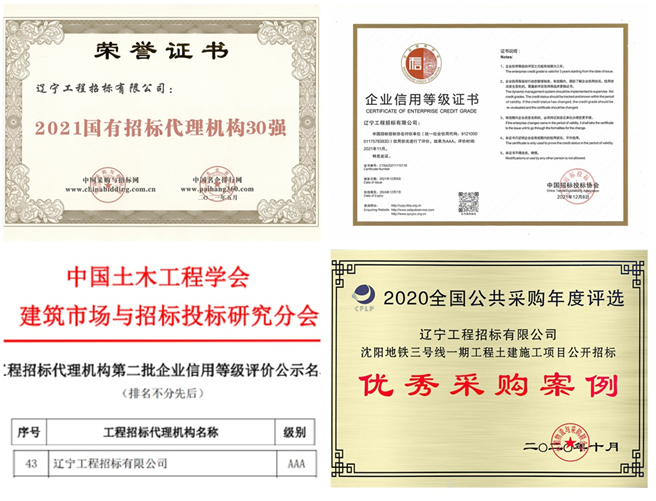 榮獲“中國招標(biāo)投標(biāo)協(xié)會招標(biāo)代理機(jī)構(gòu)信用評價(jià)AAA信用等級”。為推進(jìn)招標(biāo)投標(biāo)行業(yè)信用體系建設(shè),完善招標(biāo)投標(biāo)企業(yè)守信激勵(lì)、失信懲戒機(jī)制,中國招標(biāo)投標(biāo)協(xié)會在2021年開展了首批招標(biāo)代理機(jī)構(gòu)信用評價(jià)活動(dòng)。在本次評價(jià)活動(dòng)中,工程招標(biāo)公司獲得招標(biāo)代理機(jī)構(gòu)信用評價(jià)AAA等級殊榮,在遼寧地區(qū)名列榜首。